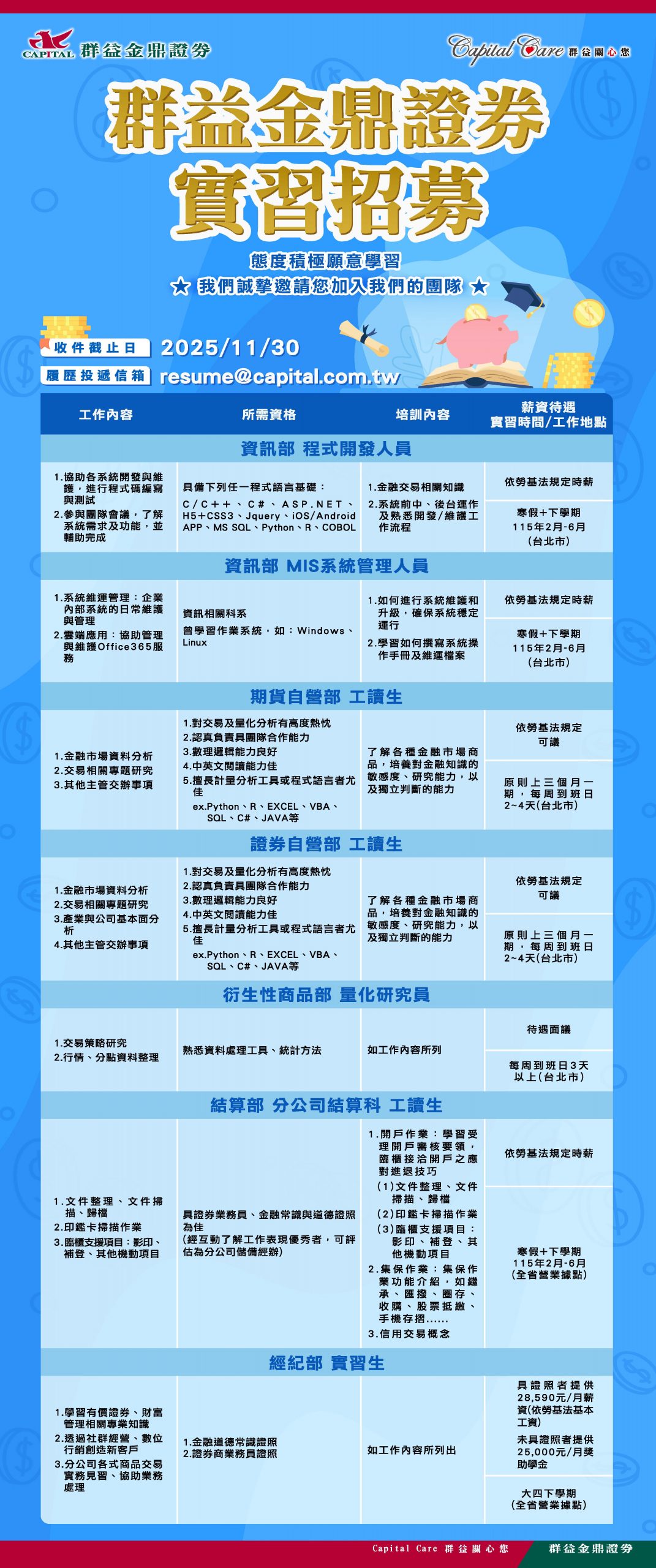 【群益金鼎證券】實習招募,收件至12/12(五)17:00止