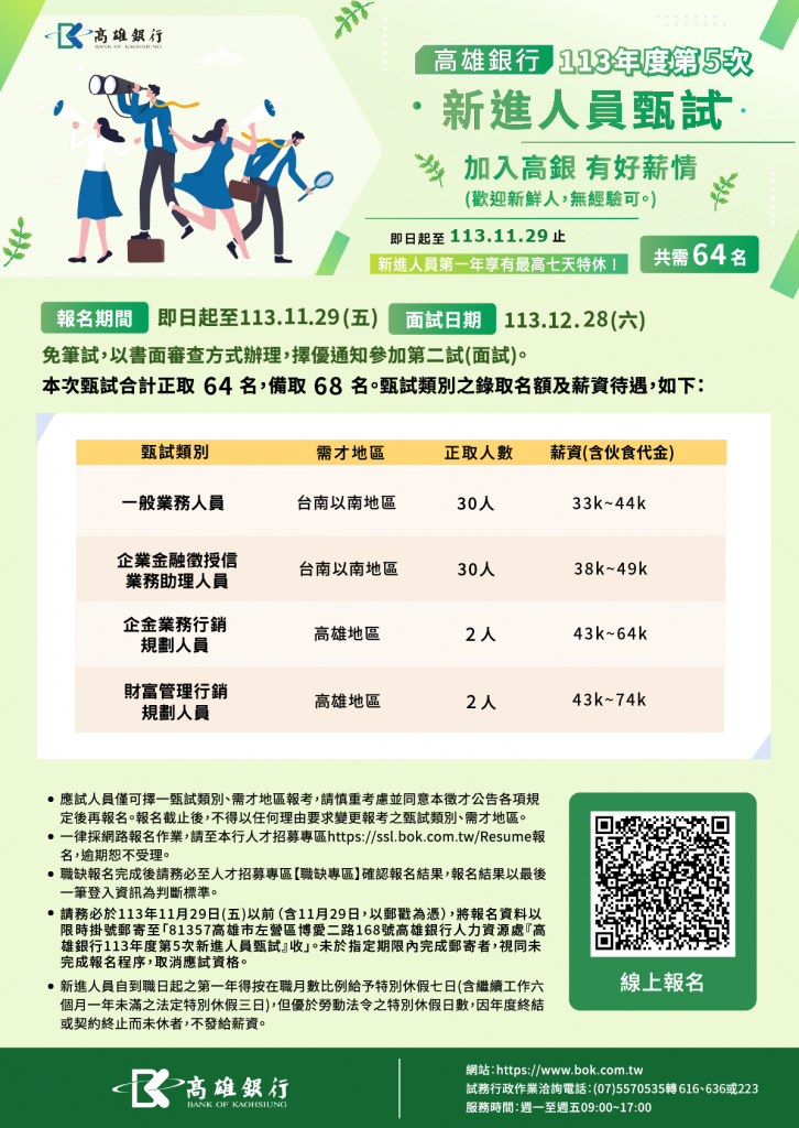 高雄銀行113年第5次新進人員徵才公告,報名期間:即日起至113年11月29日(五)14:00以前